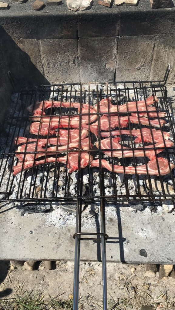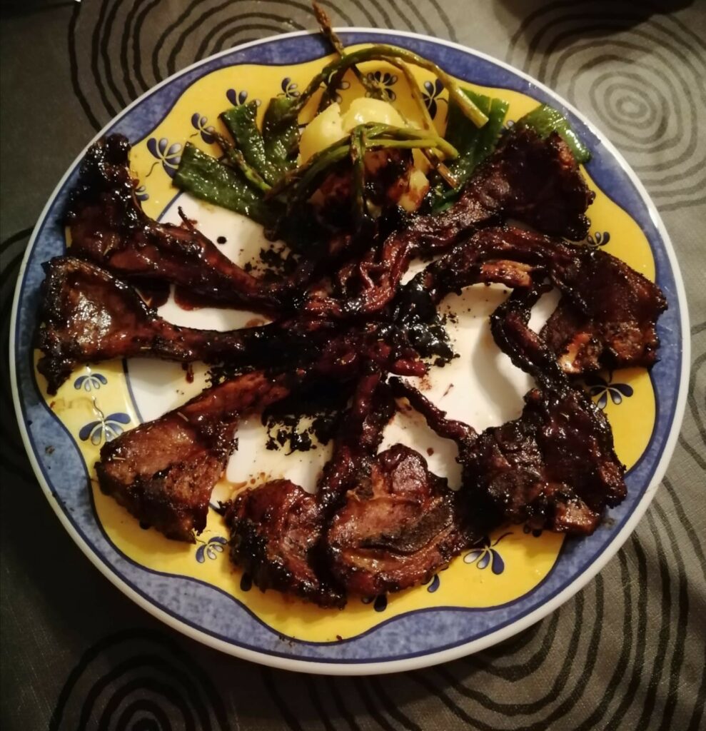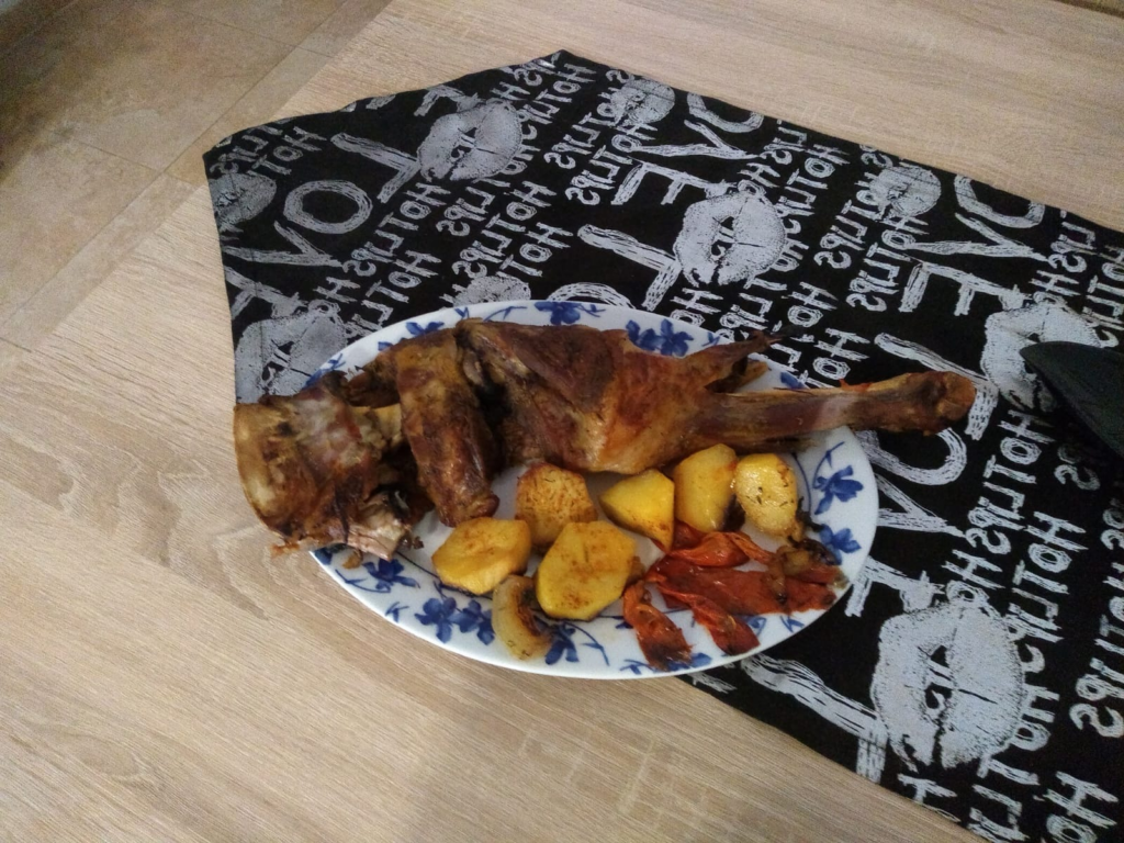 Ingredients: lamb shoulder, 4 medium-sized legs, 1 medium-sized onion, 1 small red bell pepper, a pinch of thyme, a pinch of white pepper, sweet paprika, salt and oil, white wine.