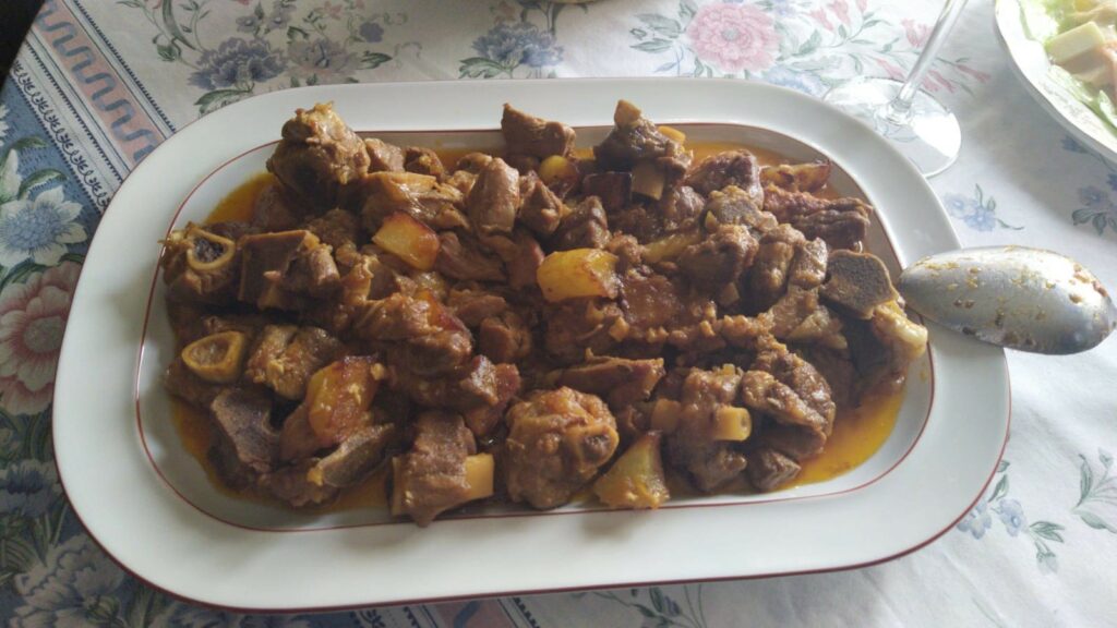 Preparation: In a pot or earthenware casserole (I did not have one), fry the garlic, onion and tomato. Then add the lamb cut into pieces. Then add the saffron, the bay leaf, the brandy, and little by little, the water (about a big glass) and stir frequently. Finally serve.